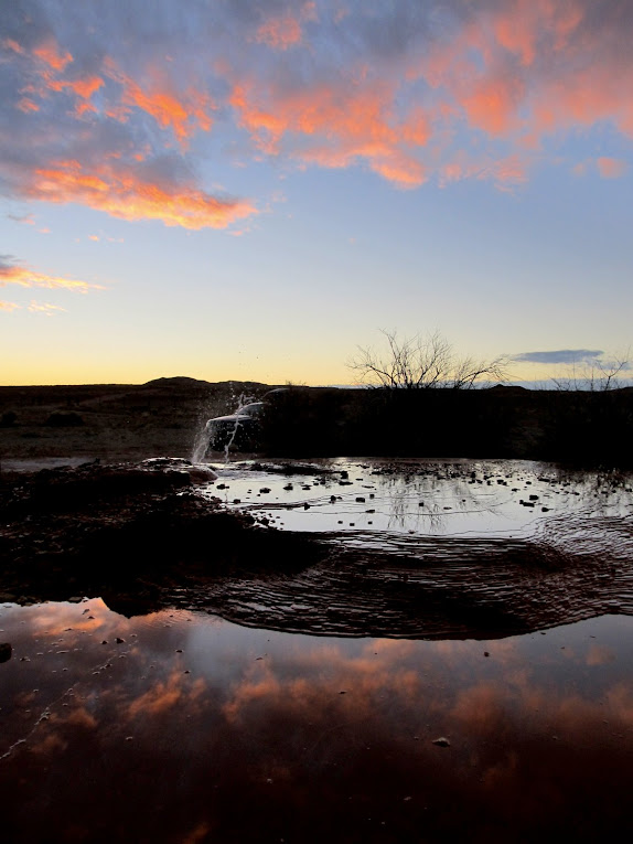 The sun was setting when we got back to the Jeep. We drove to Chaffin Geyser since Alan had never been there before. The geyser was sputtering and made for some nice images with the pink clouds reflecting off the thin layer of water. Finally, during the last few minutes of dusk, we drove another half-mile and looked at the cliffs just north of Chaffin Ranch. A camp trailer has sat abandoned there for years, and I found the graffiti on it amusing. Just as we’d begun the morning’s drive in full darkness, so did we start driving home in the dark, having fit everything into the day that we’d hoped.